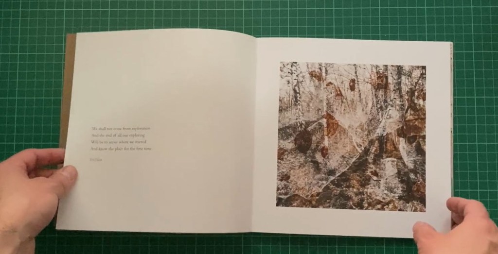 The images are multiple exposure photographs taken in a forest. I am amazed this is self-published. The design and papers are exquisite., she has even been able to use some transparent overlays. I’d have thought it handmade except that it is an edition of 25 copies. I love the cut-out cover, and some variety of image size. No page numbers or captions and minimal text.