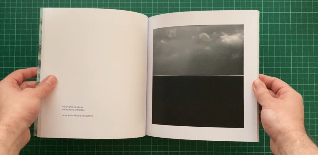 Once again I am drawn to a square book. The printed cover this time looks classy. Images of the sea and its horizon are aligned on the pages and either facing or on the right page. The text is bottom left on facing page and section pages have text to the right and not too large.
