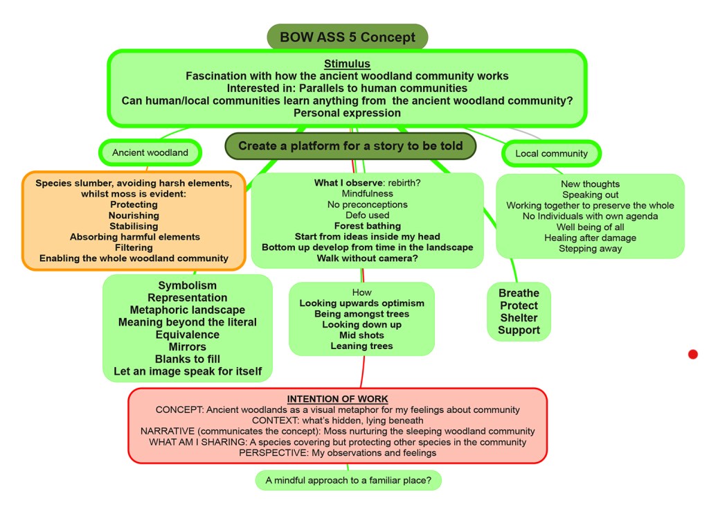 The starting point for my Body of Work, was to explore using visual representation what an ancient woodland community could teach a human community. This I developed by experimenting with a variety of visual strategies such as, changes in scale and perspective, abstraction, metaphor, and symbolism. This linked to my research for my Contextual Studies on ‘affect’ and ‘effect’, or ‘mirrors’ and ‘windows’ in landscape photography.