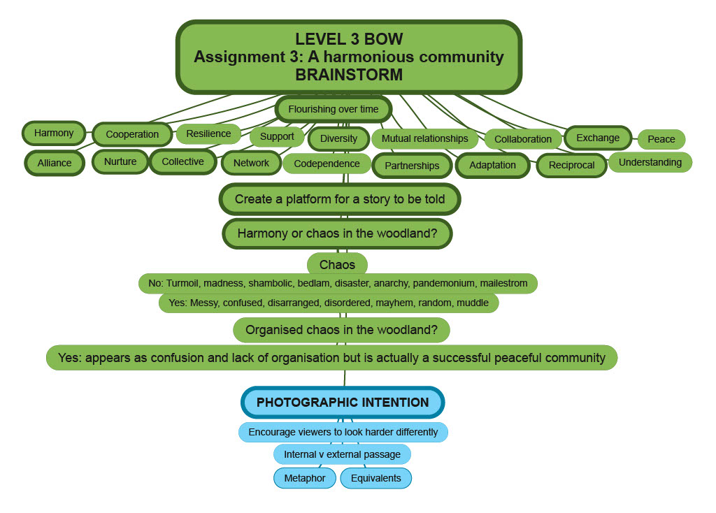 My intention to use the Ancient woodland as visual metaphor for harmonious community is currently subverted in my mind. At the moment feel that the community that I live in is more disharmonious than ever as a consequence of summer tourists as well as political and economic threats; it seems to have brought out the worst in some of the local community. I know that this is the opposite to that found in the woodlands. Could my next assignment be a contrast between harmony in the woodlands and dissonance elsewhere?