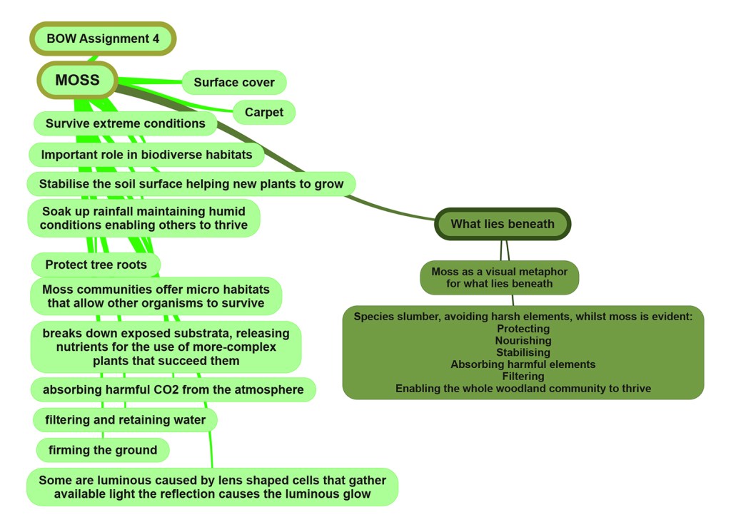 I revisited my earlier research on moss. Moss protects, nourishes, stabilises, and filters the woodland environment. It is a great showcase of just one of the woodland plant species that thrives and enables other species to thrive…it does not thrive at anyone else’s expense, and in the winter is most obvious because most other species are visually in hibernation.