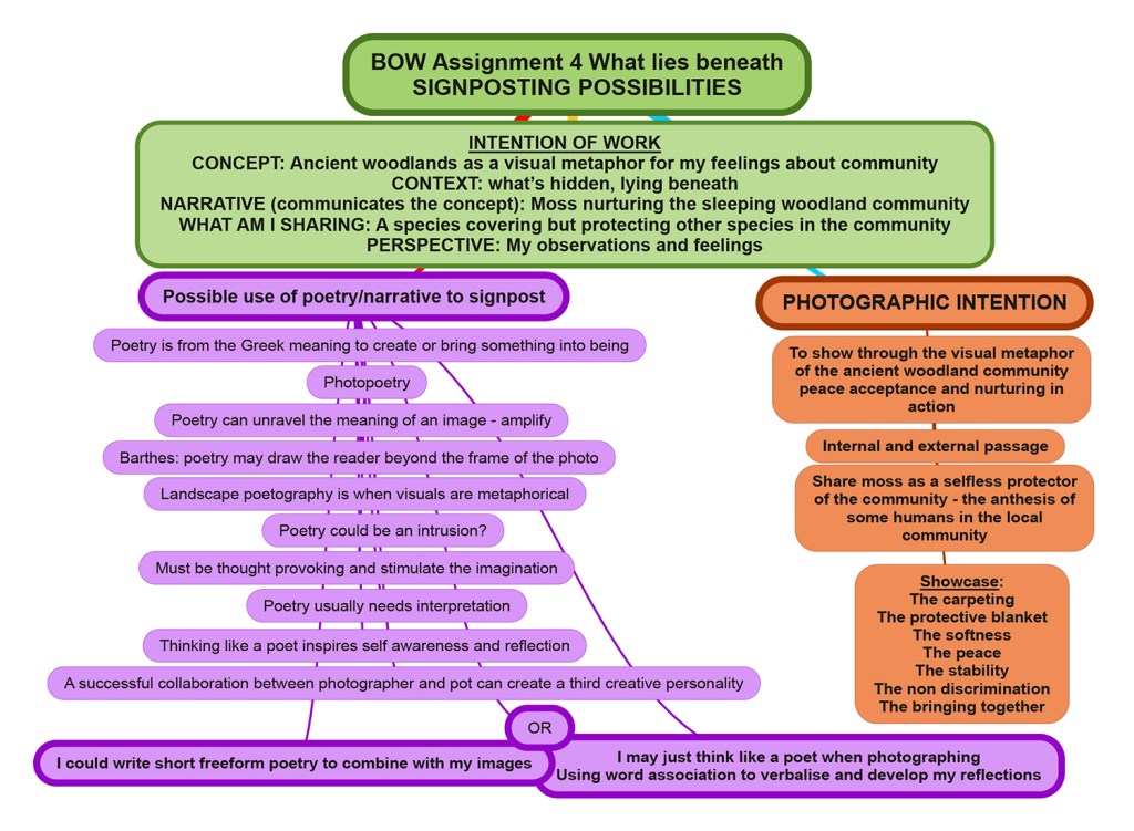 So, I revisited my visual intention. I would focus on the moss in the woodlands as an example of a nurturer and protector, a reflection on the harmony which is possible in diverse communities and a visual antithesis of some harmful elements in the disharmonious local human community.