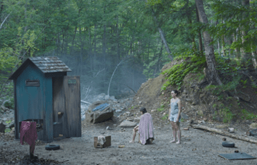 The broken shed/toilet behind them appears in several of his shots. The two teenagers, one seated after a haircut stare passively, as is usual in these images. Why is there a bicycle on the floor? Does it connect him to his childhood? The dirty blankets are there again, but why is the tyre on the floor? As a viewer I know that everything is there for a reason. In the middle of this forest their actions are suburban which provides the uncanny element and an open-ended narrative.