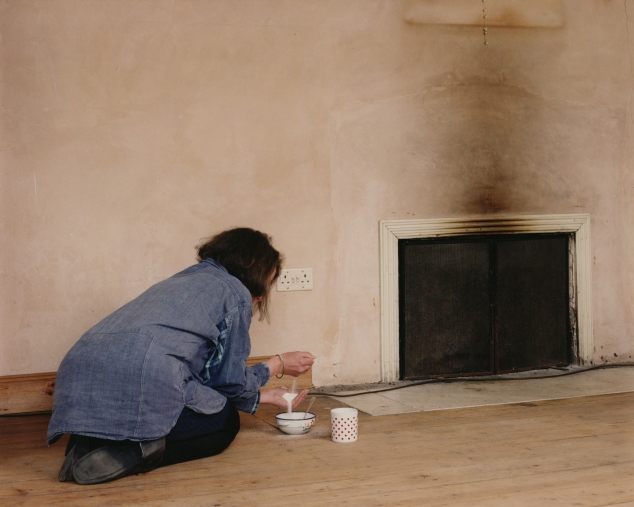 A girl with a non-expression staring at dead flowers on a bench, sits in a dilapidated barn with the door open. Look closely and where the floorboards are up, suggesting a hiding place, and dead birds lay on a shoe box lid, next to the void. As a viewer I am beset with questions that I have no answers to.