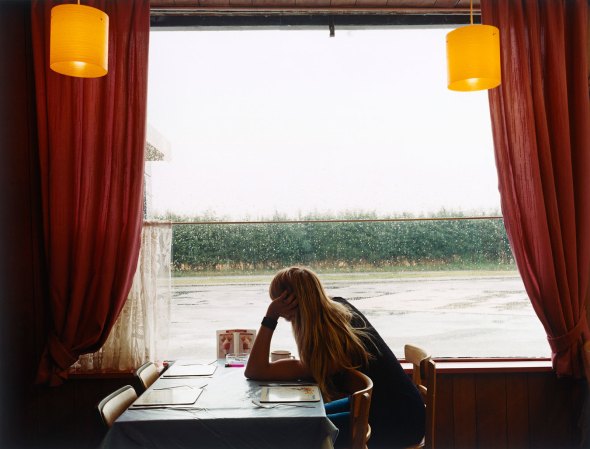 He often shoots in the twilight of dusk, although the mist may be added for effect. A woman apparently in only her underwear sits in the cab of a car, whilst a man stands inside at the sink also staring into space. The driver’s door is open, why? The cabin door is open as many of the doors in his images are.