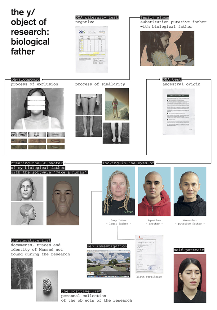 Her previous work “The Y- Research of Biological Father” (2019), her search for her biological father, similarly includes media such as paternity tests, created avatars, web documents, and self-portraits.