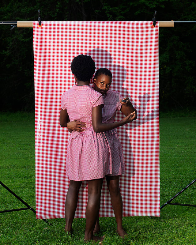 explores cultural identity, race, memory and immigration through photography, video, and installation with a series of self-portraits, featuring herself and friend posing as her with abstract landscapes constructed backgrounds.