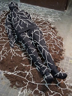 Jae Rhim Lee a Korean American artist, has designed an organic cotton, wood, and biomaterial burial suit, where she has sewn in mushroom spores to help a body decompose and deliver nutrients but not toxins to the environment.