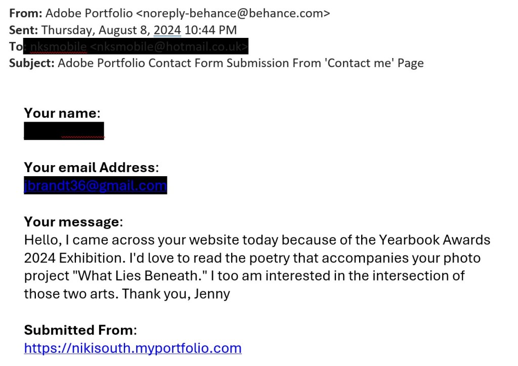 Unlike other submissions they asked for little information on the work simply: Niki South, British, living in Wales. The work is from my series ‘What lies Within’ found on my website: https://nikisouth.myportfolio.com .
